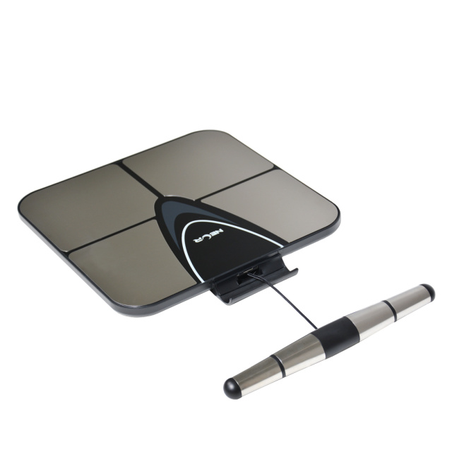 Чотири високоточні датчики розташовані на платформі з нержавіючої сталі, а ще чотири — в ергономічній висувній рукоятці. Коли ви стаєте на ваги та тримаєте рукоятку, система біоімпедансного аналізу (BIA) вимірює показники не лише нижньої частини тіла, а й рук та тулуба. Це дозволяє отримати сегментовані дані та значно підвищує точність аналізу, наближаючи її до рівня професійного медичного обладнання.
