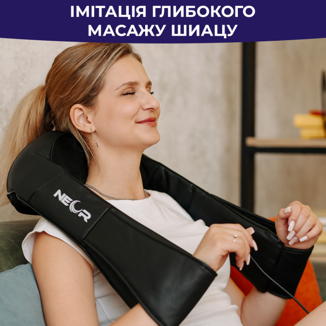 NEOR RELA MN30 BK — це ідеальне рішення, щоб позбутися напруги та болю в шийно-комірцевій зоні після довгого дня за комп'ютером чи кермом. Уявіть, що теплі та вмілі руки професійного масажиста розминають ваші втомлені м'язи — саме такі відчуття дарує цей масажер.