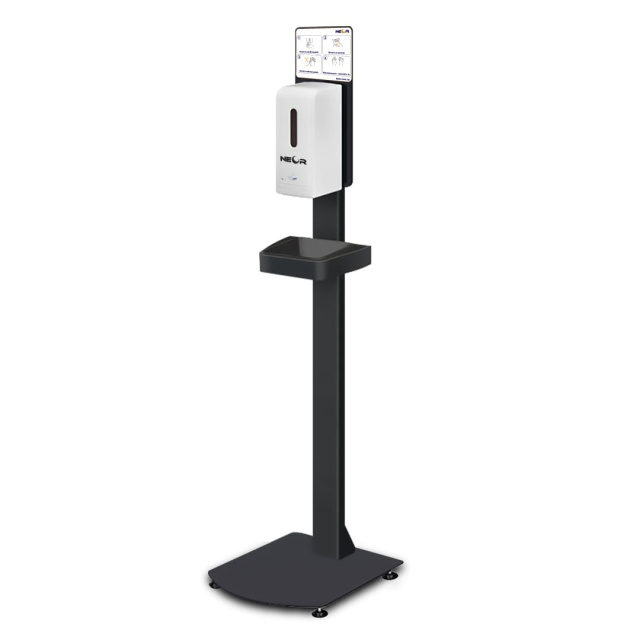 Сенсорний дезінфектор для рук NEOR SD-10 розміщений на металевій стійці з коліщатками, піддоном та інформаційним таблом.
