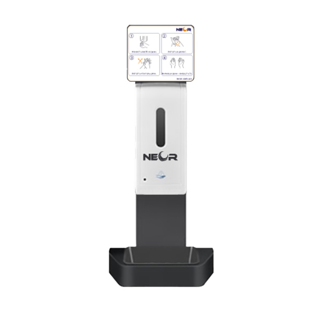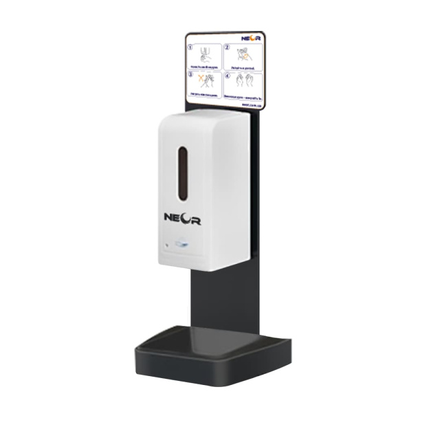 Ця модель сенсорного дезінфектора ідеальне рішення для громадських закладів з обмеженим вільним простором. Він просто кріпиться до стінки або ставиться на будь-яку горизонтальну поверхню. Має спеціальний металевий піддон, щоб запобігти потраплянню антисептика на підлогу. Живиться від батарейок, то ж немає необхідності розміщувати його поруч з розеткою.