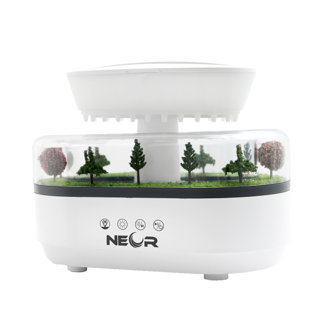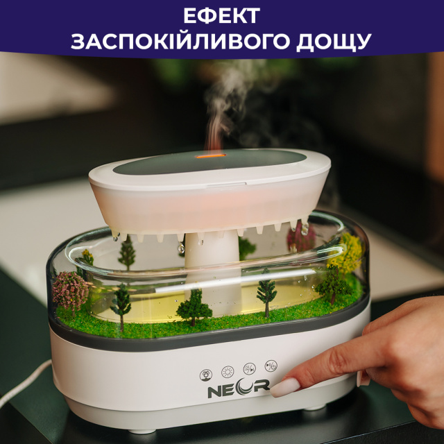 Пристрій створює м'який, прохолодний туман за допомогою ультразвукової технології, ефективно зволожуючи повітря. Але його головна магія — це симуляція дощу. Ви можете спостерігати, як краплі води падають з "хмаринки" на мікроландшафт, створюючи медитативний звук та візуальний ефект. Додайте до цього улюблену ефірну олію, і ви отримаєте повноцінний сеанс арома- та звукотерапії.